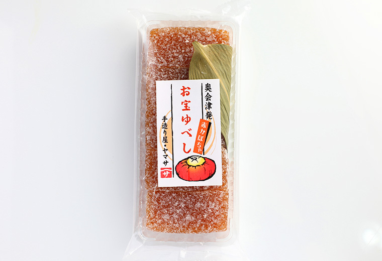 地元で採れる食材や薬草を用いて身体に良い食品を長年製造してきたヤマサ商店が、昨今、惚れ込んだのが奥会津金山産の伝統野菜である〝赤かぼちゃ〟。「甘味があっていい味が出るんだよ」と新しい風味のゆべしを生み出した。小麦粉は使わず餅粉100%。2時間かけてじっくり蒸し上げたその食感は柔らかくもちもち。もちろん添加物不使用。1枚1枚丁寧に手づくりしたゆべしは、赤かぼちゃの自然のままの味わいが楽しめる。